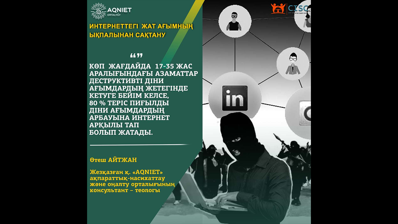 Егер діни тақырыптар бойынша Интернеттің ішкі сегментіндегі қауымдастықтардың саны мен ерекшелігі туралы айтатын болсақ, онда Вконтакте және Facebook сияқты әлеуметтік желілердегі ең белсенді қауымдастықтар дәстүрлі емес ислам идеологиясының 70% және дәстүрлі исламның 30% құрайды. Діни экстремизм мен терроризм қаупі туралы хабардар болу, дін саласындағы проблемаларды неғұрлым терең түсіну, экстремистік нарративтерге қарсы іс-қимыл, сыни ойлау дағдыларын қалыптастыру жастар арасында діни экстремизмнің алдын алу әдістерін енгізу кезінде ескеріледі. Жастар арасында діни экстремизмнің алдын алу проблемасы, ең алдымен, әрбір отбасының, қоғам мен мемлекеттің жауапкершілігі шеңберінде қаралады. Азаматтық қоғамдастықтың мемлекеттік органдармен осы бағыттағы бірлескен жұмысы елеулі табыстарға қол жеткізуге мүмкіндік береді. Қоғамның түрлі топтары арасында діни экстремизмнің алдын алуға бағытталған жаңа тәсілдер мен технологияларға сұраныс пен талаптар өсуде. Осыған байланысты, интернет-кеңістікте әлеуметтік желілерді пайдаланатын жастардың рухани қауіпсіздігін қамтамасыз ету мақсатында зайырлы өмір салтының құндылықтарын, Қазақстан халқының ұлттық рухани дәстүрлерін және конфессияаралық келісімді насихаттау өте маңызды. Діни экстремизм мен фундаментализмнің таралуына кедергі келтіруі мүмкін тетіктерді жетілдіру қажет. Біз болашағы зор, жаһандық көшбасшы, білімді, жігерлі, жаһандық нарықта бағасы мен сапасы жағынан неғұрлым тиімді нәрсе ұсынуға қабілетті біртұтас халық ретінде бәсекеге қабілетті ел болуға ұмтыламыз.